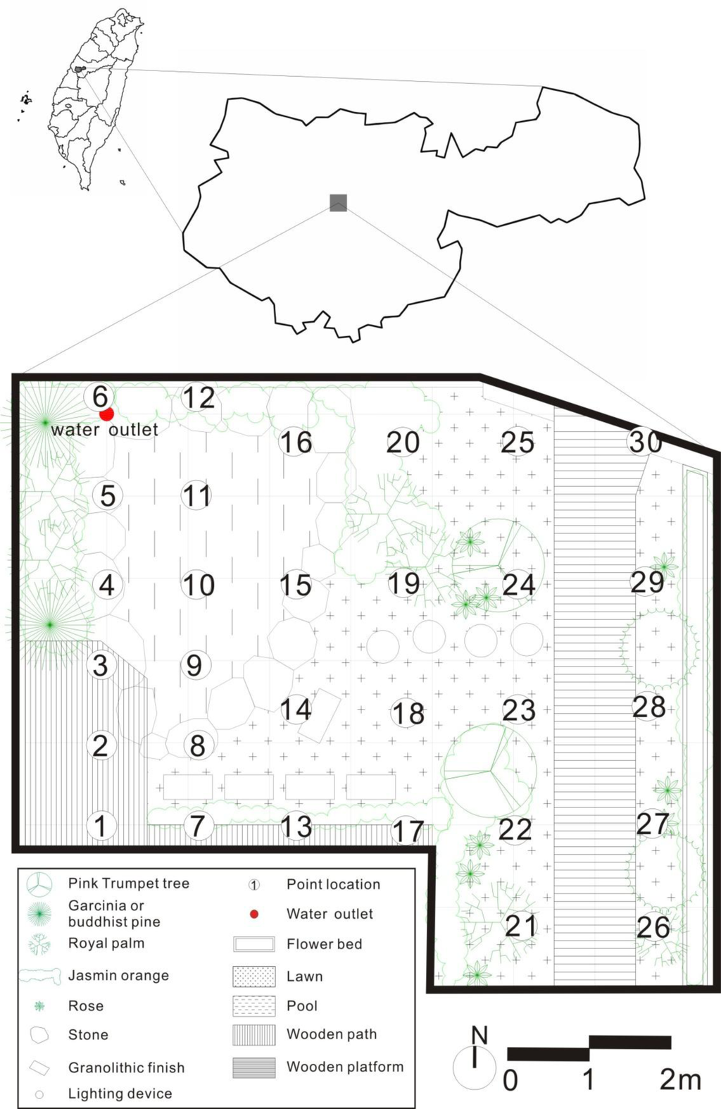 - Wu, CF; Lin, WH; Lai, CH. Relationship between residual garden landscape and air irons distribution. J Archit 2010, 71, 213–232. (in Chinese).. [Google Scholar]