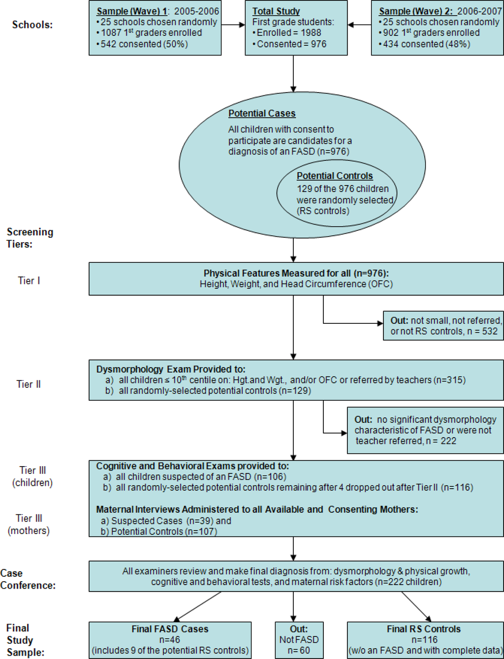 Because the first tier screening in this in-school study primarily sought children who were small or had small OFC, we were most likely to detect children with a severe form of FASD, e.g., FAS and PFAS. That was our intent. Other than the children who were specially referred by teachers as having learning or behavioral problems, we undoubtedly missed cases of ARND. Monetary and time limitations dictated that we limit our first tier screening to a small number (≤10th centile on OFC and/or height and weight) in order to locate the most affected. Teacher referrals were encouraged by the research team and were made for children whom the teachers believed were struggling with their lessons, were behaviorally disordered, or showed some other signs of having features of FASD.