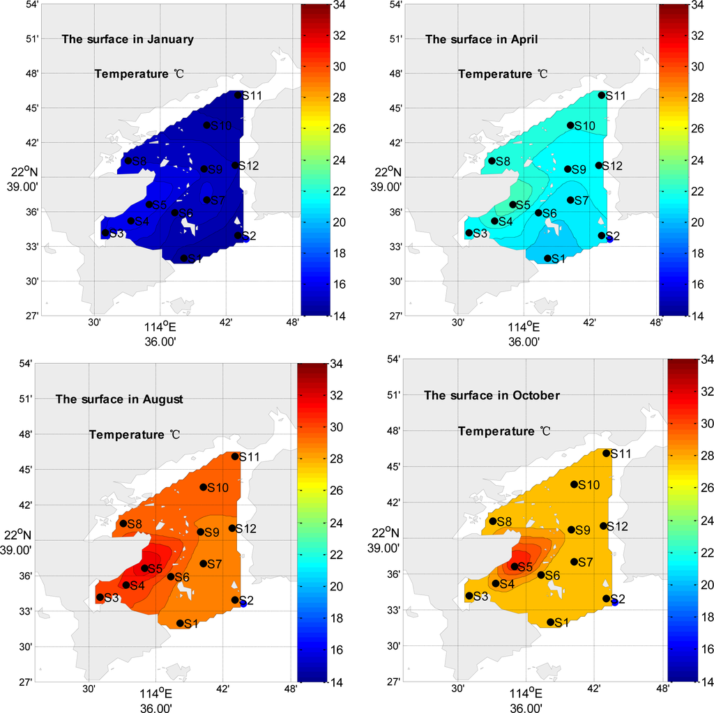 The horizontal distributions of the surface temperature are similar in all four seasons, with higher values in the western and north parts of the bay than in other parts of the bay (Figure 2). The horizontal distributions of the surface salinity are similar in four seasons, the surface salinity decrease from the mouth to the top in the bay in summer; it is higher in the eastern and northern part than that in western part in winter (Figure 3). In summer, the salinity is lower than that in other seasons; the rain is an important factor, which diminishes the surface salinity.