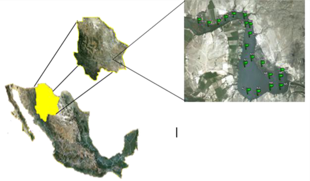 Map showing Mexico, the State of Chihuahua and the sampling points around Colina Lake.