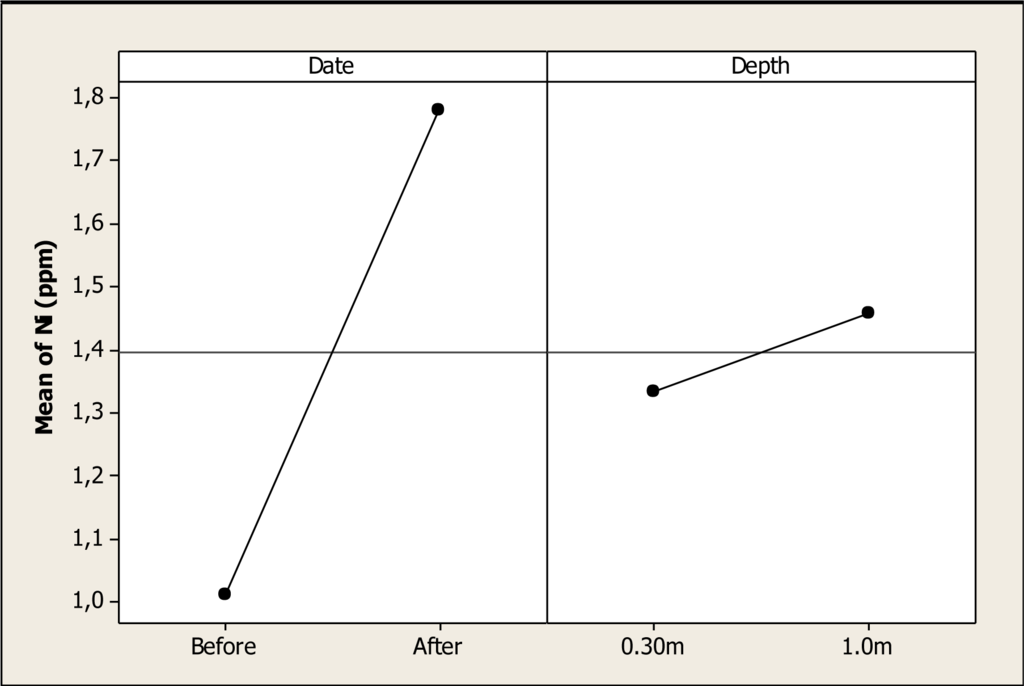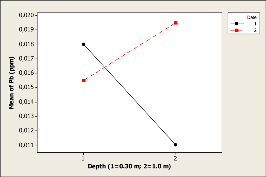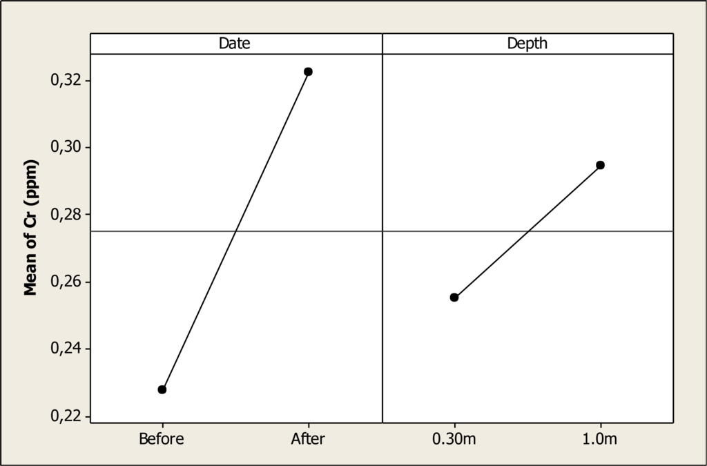 The Cr concentration was statistically different for date (P < 0.000) and depth (P < 0.000), but no differences were discovered for the interaction date-depth (P = 0.554). Figure 5 shows the main factors effect where it is noted that the Cr level increased from 0.22 ppm before the Holy Week vacation period to a level of 0.32 ppm after this period. In addition, it is observed that this element rose from 0.25 ppm at 0.30 m depth to 0.29 ppm at 1.0 m depth. The results in this study are similar to the levels reported previously in the Conchos River during 2005 with a Cr concentration of 0.25 ppm []. Nevertheless, in another study carried out in a tributary of the Conchos River, Gutierrez et al. [] reported levels of Cr as higher as 0.014 mg L–1; thus, the level of the present study for Cr concentration is higher than previous studies in the same area.