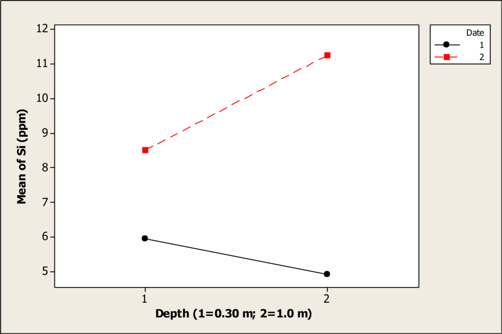 The Si concentration was statistically different for sampling date (P < 0.001), but no differences were noted for depth (P = 0.333). The date-depth interaction was significant (P = 0.01). Figure 12 shows this interaction effect, where it is noted that the mean of Si at 0.30 m depth, before the Holy Week vacation period, was about 5.9 ppm, and then, this level decreased to 4.9 ppm at 1.0 m depth. With respect to after Holy Week period, the Si level was about 8.51 ppm at 0.30 m depth, and then increased to a level of 11.25 ppm at 1.0 m depth.
