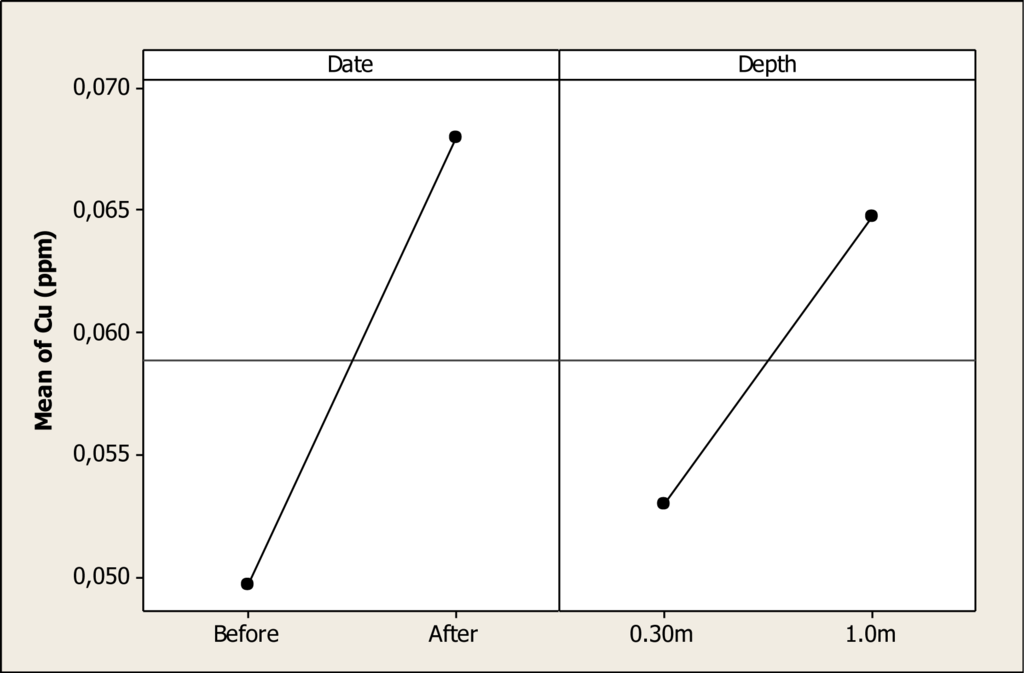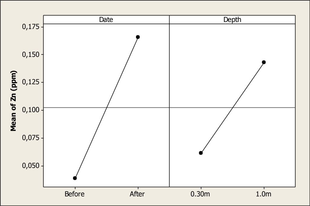 The Zn concentration was different for sampling date (P < 0.001) and depth (P = 0.01), and the interaction was not significant (P = 0.12). Figure 13 shows the main factor effects where it can be noted that the mean of Zn before the Holy Week vacation period was 0.03 ppm, and then after this period the concentration increased to 0.16 ppm. Also, the mean of this element before the vacation period was 0.06 ppm at a depth of 0.30 m, and this value increased to 0.14 ppm at 1.0 m depth after the vacation period.