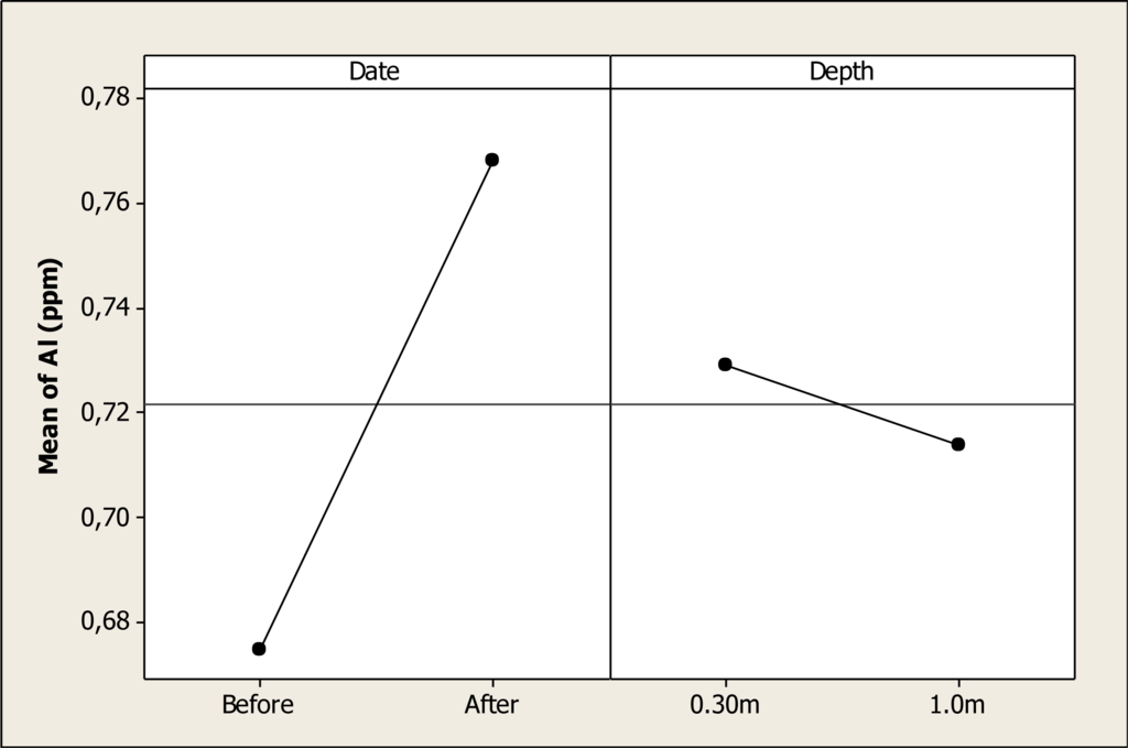 The ANOVA analysis detected differences for Al concentration due to date of sampling (P < 0.001); but no differences were noted for sample depth (P = 0.591) nor their interaction (P = 0.496). The mean Al level before the Holy Week vacation period was 0.67 ppm, while the mean concentration after this period was 0.76 ppm. Figure 2 shows this main effect and domestic tourism is probably contaminating this water reservoir with Al.
