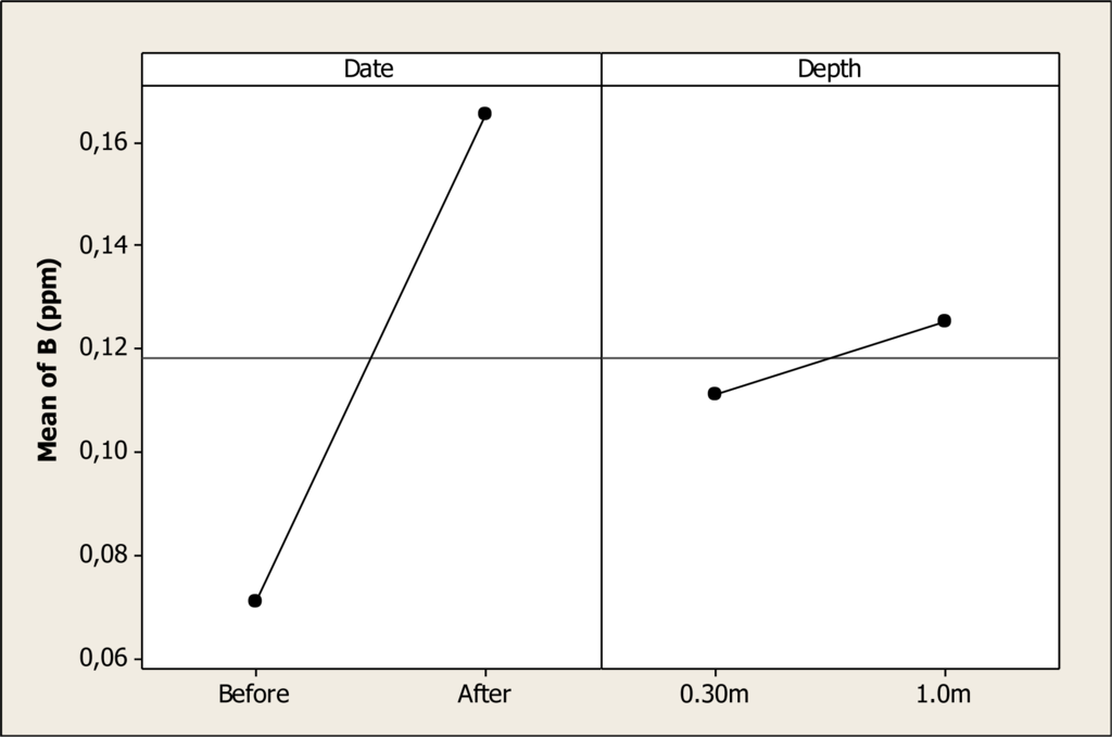 The ANOVA detected statistical differences in B levels as a function of sampling date (P < 0.001) but no differences were noted for depth (P = 0.168) or the interaction (P = 0.843). This mean effect is shown in Figure 3, where a maximum B concentration with a mean of about 0.16 ppm was observed after the Holy Week vacation period, in contrast with a mean of 0.07 ppm noted before. Holguin et al. [] reported levels of B of 0.518 mg L–1 in the lower part of the Conchos River in the same state, and Colina Lake is situated in the upper part of the Conchos River.