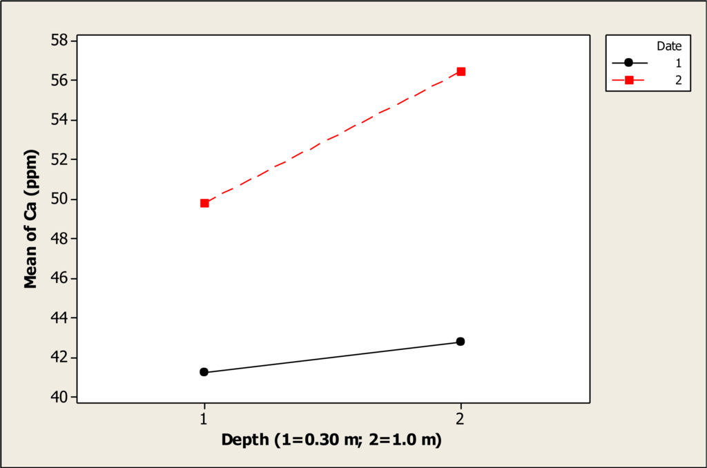 The ANOVA gave statistical differences in regard to Ca concentration for date (P < 0.001), depth (P < 0.001), and the interaction date-depth (P < 0.004). This interaction effect is shown in Figure 4. Before the tourists visited in the Holy Week vacation period, the Ca concentration was about 41.2 ppm at the 0.30 m depth, and this value increased slightly to about 42.7 ppm at 1.0 m depth. Moreover, the Ca level after the Holy Week period increased at both depths. At 0.30 m depth the Ca concentration was 49.8 ppm and then increased to 56.4 ppm at 1.0 m depth. It is important to mention that there is no specific Maximum Permitted Level for this element in the Mexican norms. Any recreational lake can be classified according to the level of calcium carbonate; for instance, the Grand Lake in the United States of America was classified as moderately hard water lake []. Therefore, it is necessary to continue with the monitoring of this lake under study to know more about the different elements like Ca in the water at different seasons. Gutierrez et al. [] found that Ca concentration increased in the lower part of the Conchos River, reaching levels of 120.23 mg L–1. These authors also showed that Ca levels increased in the rainy season, and it has to be pointed out that the present study was done in a different season.