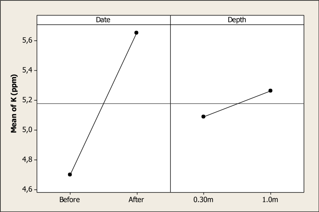 Potassium concentration was different as a function of sampling date (P < 0.001) and sampling depth (P = 0.019), and the interaction date-depth was not significant (P = 0.936). Figure 7 shows the main factor effects for this element. It can be seen that before the Holy Week vacation period, the mean concentration was 4.7 ppm, and this level increased to 5.65 ppm after this period. With respect to the depth factor, the mean at 0.30 m depth was 5.08 ppm and 5.26 ppm at 1.0 m depth. Even though a K concentration effect due to human presence in Colina Lake can be noted after the vacation period, this amount does not represent a health risk to local visitors.