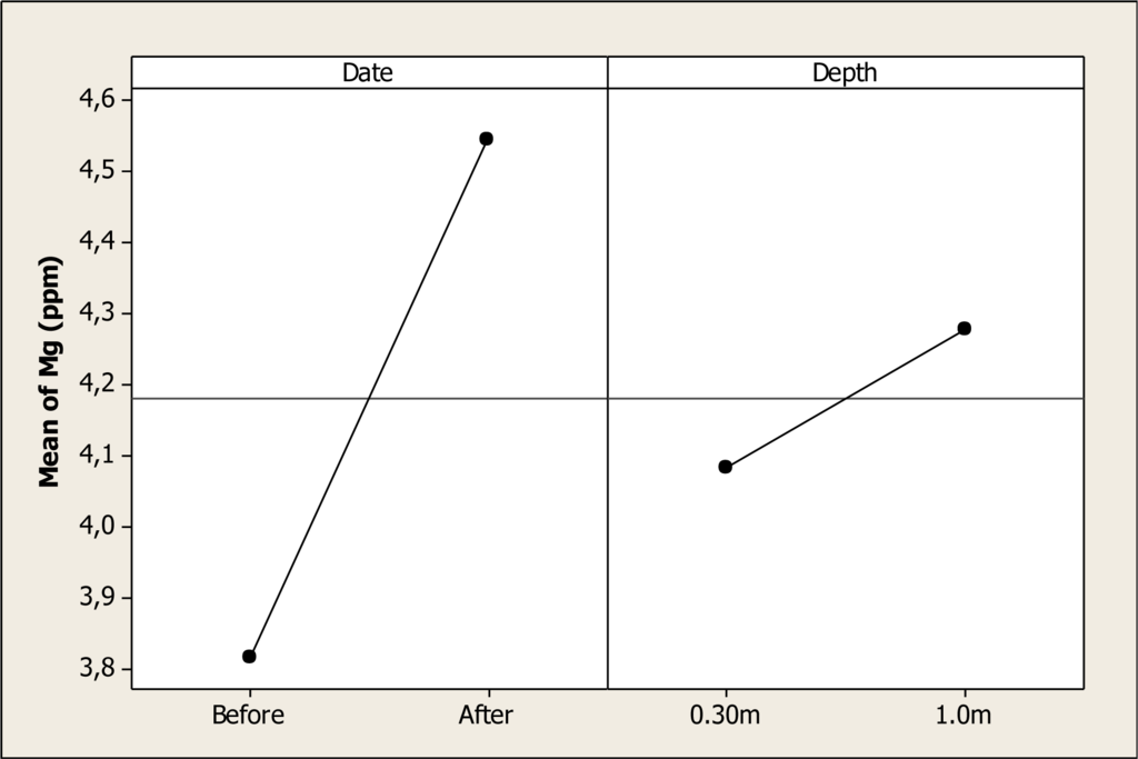 For Mg, the ANOVA showed significant differences in date (P < 0.001) and for the depth factor (P = 0.007) but no differences were noted for the interaction (P = 0.927). The Mg means before the Holy Week vacation was 3.81 ppm, and after this vacation period it increased to 4.54 ppm (Figure 8). It can also be noted that the mean Mg at 0.30 m depth was 4.08 ppm, and then it increased to a level of 4.27 ppm at 1.0 m depth. The Mg levels reported in this study are lower than those reported previously by Rubio-Arias [] in a study conducted on six tributaries of the Conchos River.