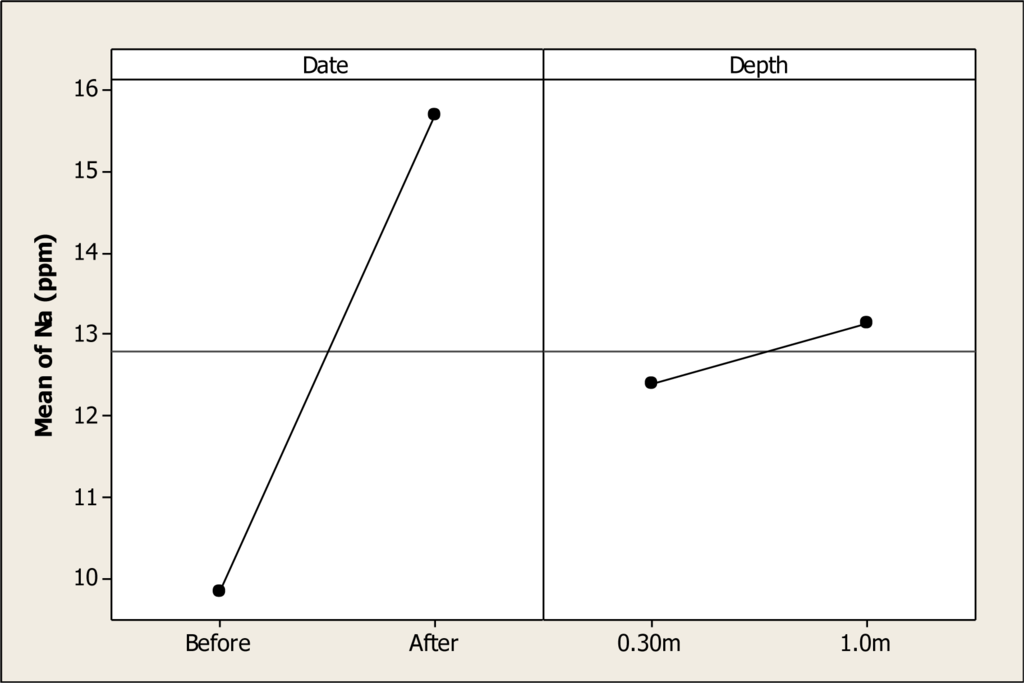 Main effects plot for Na in Colina Lake water samples (Chihuahua, Mexico) before and after the 2010 Holy Week vacation period.