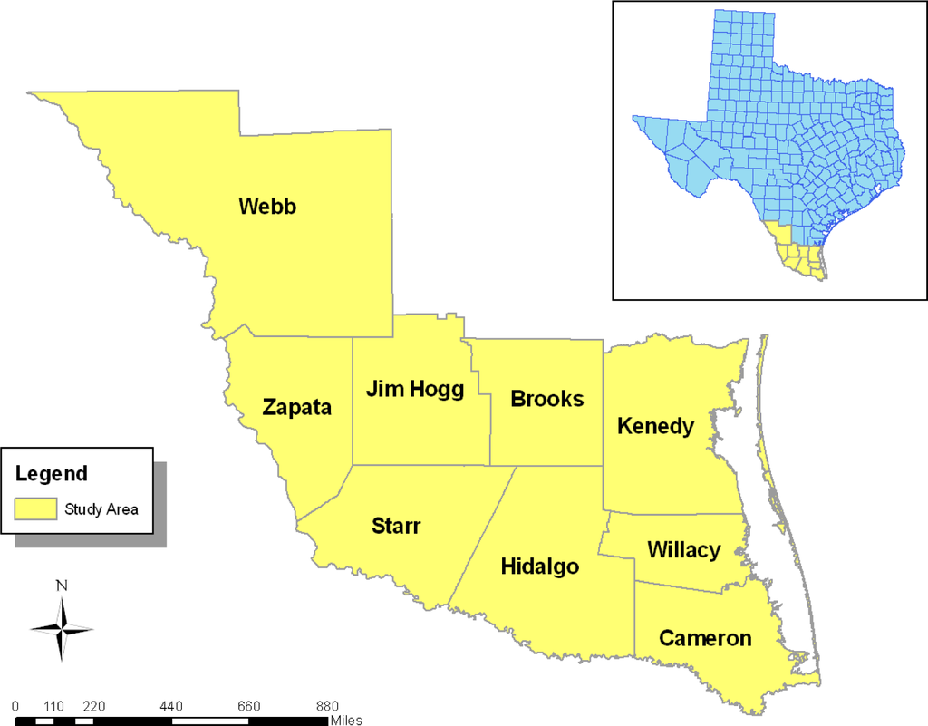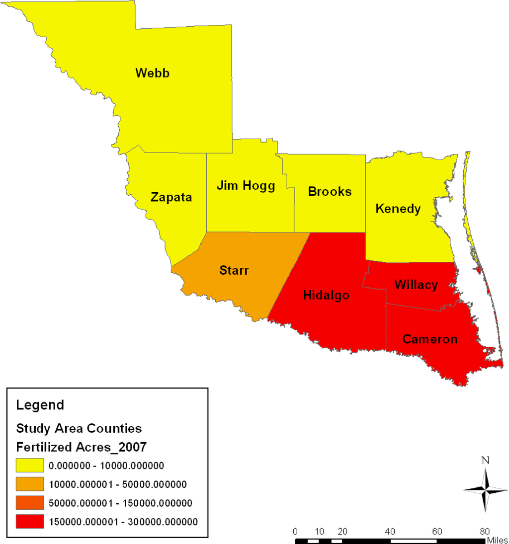 The study area of South Texas as shown in Figure 1 is located in the coastal plains of the state adjacent to the Gulf of Mexico. The South Texas region stretches through a land mass estimated at 8,828.13 square miles made up of nine counties. In 2007, when the study area had a total population of 1,416,930, about 6,476,152 acres of land were devoted to farming with 62,500 acres of farm land treated with fertilizer. As an important region in the state of Texas, the south Texas region not only provides habitat for fisheries but also homes different life forms listed as rare, endangered and threatened [17]. Accordingly, the South Texas Coastal Plain supports unique ecosystems and wildlife, including barrier island dunes, beaches, sea grasses, and the Baffin Bay and Rio-Grande Delta.