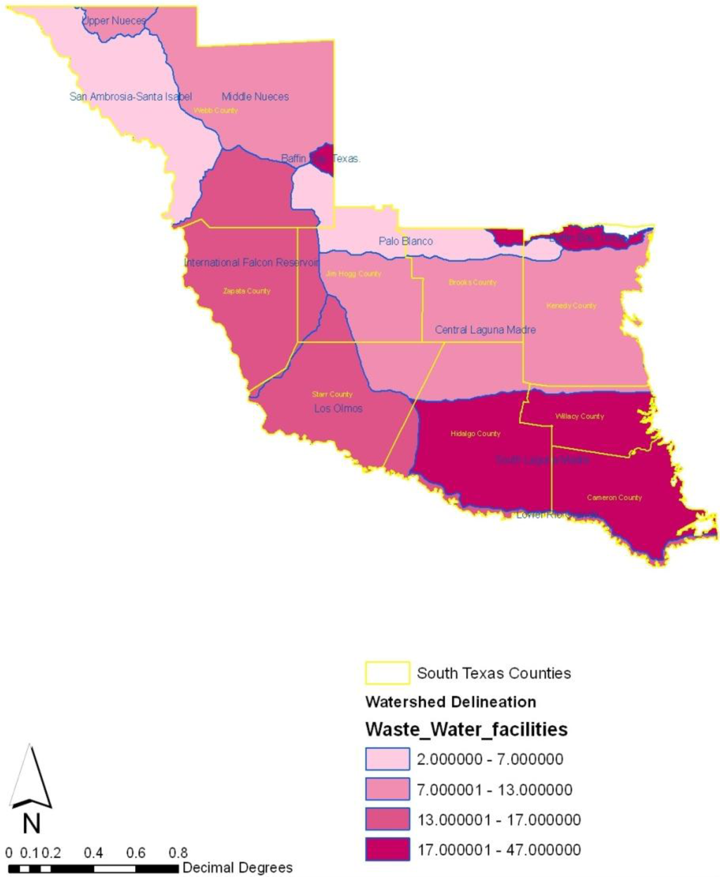 In terms of the watersheds in the area, several issues that emerged include the problem of impaired water bodies, percentage of surface waters impaired, source of pollution, number of waste water facilities draining into the water bodies. Of the total of 16 impaired water bodies, the watershed at Baffin Bay and South Laguna Madre were classified under the impaired category while central Laguna Madre had two impaired watersheds. The rest of the water bodies made up of Intercontinental Falcon Reservoir, Los Olmos, Lower Rio Grande, Middle Nueces, San Ambrosio–Santa Isabel and Upper Nueces experienced significant impairment during the period under analysis. On the percentage of surface water area impaired, Baffin Bay, Central Laguna Madre and lower Rio Grande were the three most notable watersheds that each had about 100% of their surface water area impaired. Among others, International Falcons reservoir had 3% of its surface area under impairment while Upper Nueces, San Ambrosio–Santa Isabel and south Laguna Madre had about 13%–17% of their surface water impaired. The sources of pollution on the watersheds as the table indicates consist of pesticides, non-point sources, pathogens, municipal pathogens, and organic enrichments. Another twisting to the status of watersheds in the study area stems from the threats posed by the growing number of waste water facilities draining into the watersheds. From Table 8, note that the watersheds at Baffin Bay and Laguna Madre have 44–47 waste treatment facilities that exceeds the number in the other areas. The number of waste treatment dumping facilities estimated at 17 each in three other watersheds seemed higher than the 11 other operations draining into the central Laguna Madre. Among the other water bodies as the table shows, Middle Neuces had about 13 facilities while Palo Blanco, San Ambrosio–Santa Isable and Upper Neuces maintained 2–7 sites respectively (Table 8).