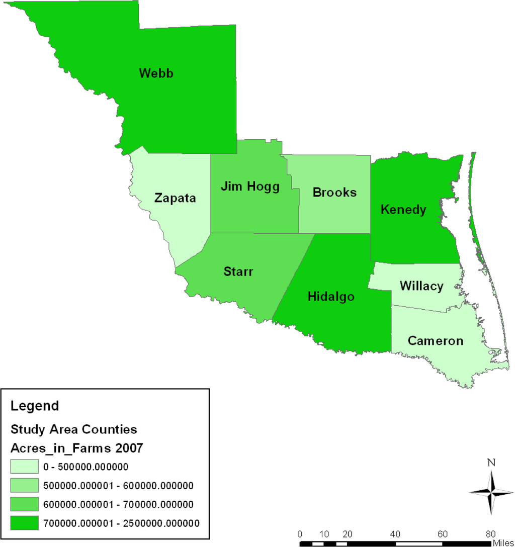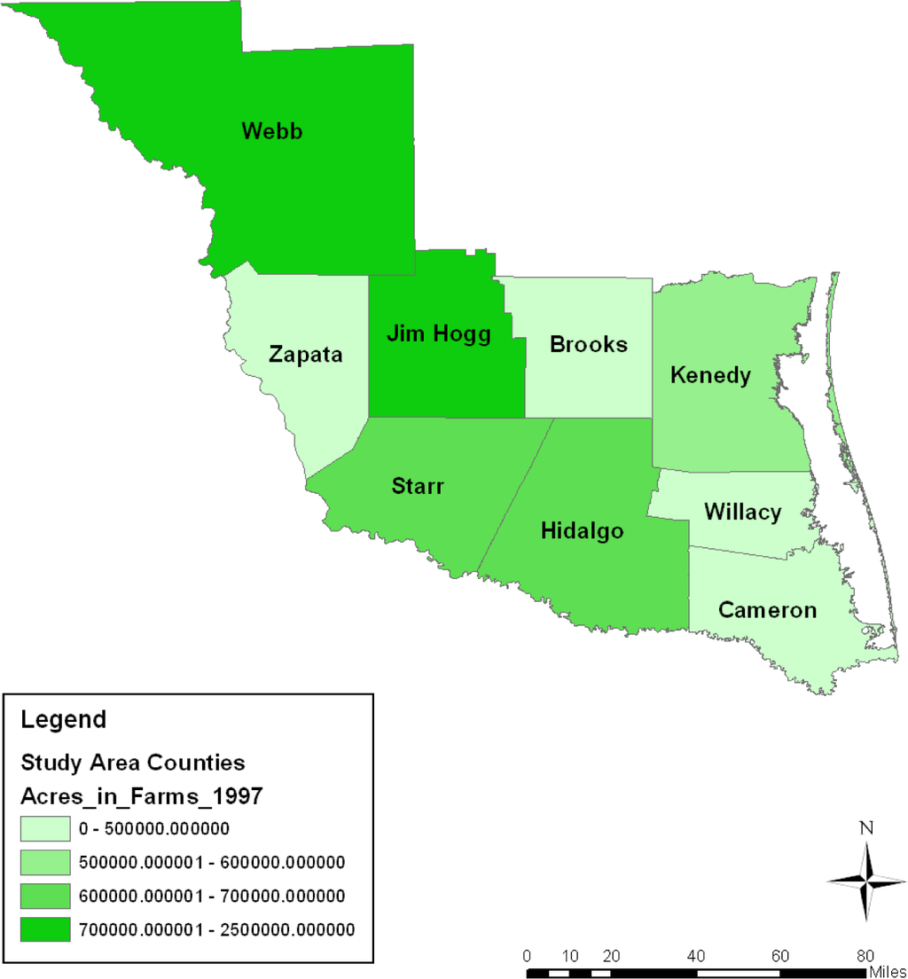 In the second stage, agricultural data related to farm operations, and other forms of human activities such as land development and basic descriptive statistics were employed to transform the original data on environmental variables into relative forms of percentages. The purpose of this descriptive statistics analysis is to generate categories and matrices vital to the paper. Under this process, the parameters for establishing the temporal changes in the variables and their relationships to the influence of human activities on agricultural watersheds were generated for the counties in the South Texas region. Emphasizing county level and watershed data analysis across time helps facilitate a gradual appraisal and comparison of the trends in the region over the years. The time series approach is essential in pointing out the changes in the variables from farm land acreage to building permits. This approach allows one to detect levels of change with the tables highlighting the trends and problems facing the study area. The remaining steps of data analysis are somewhat similar to the time series analysis at the county level. They consist of GIS based spatial analysis and output in the form of maps, tables and textual information covering the study periods. The number of spatial units of analysis at the county level consisted of several units as shown in the study area map (Figure 1). The 2007 study area map contains information on several objects such as polygons and lines indicating boundary limits of the counties and their geographic identification codes. The statistical output of the farm land acreage distribution along with those of other variables from the spatial areas units were mapped and compared across time in ARCVIEW GIS. The process helped delineate the spatial locations, patterns and trends highlighting agricultural elements and other socioeconomic and environmental indicators associated with ecological decline along the agricultural watersheds in the study area.