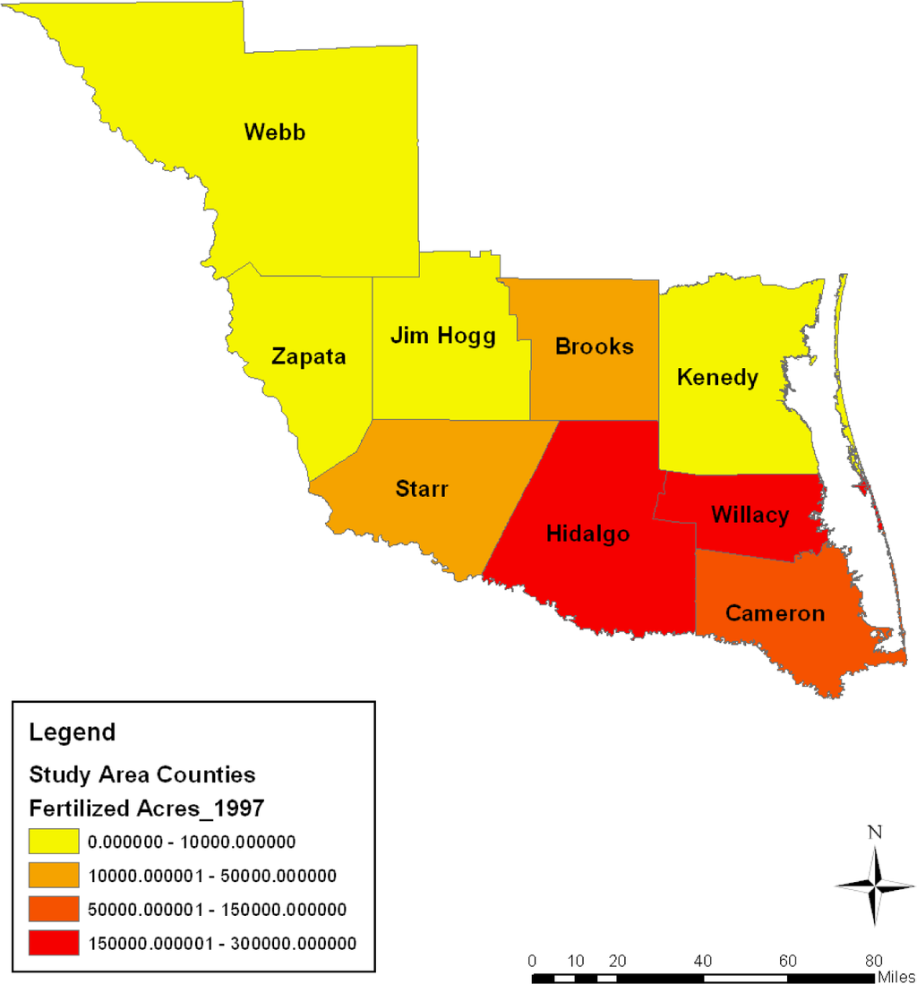 This part of the paper presents environmental analysis with focus on the results of the GIS and descriptive statistics analysis tracking the state of the ecosystem in the area and change over the years from a temporal and geospatial perspective. The analysis of the agricultural land use, fertilizer use, harvested land, total area of cropland, irrigated land, municipal waste discharge and watershed pollution occurring in the area along with the impact assessment of development in the region are also presented. The study area stands as a heavily farmed area with intense activity occurring in all the entire nine counties from 1997 to 2007. This can be buttressed by considering a three tier classification system outlining the distribution of agricultural land among the counties. The first tier county rank based on farmland area during the census years points to Webb county. The farm size in the area as a measure of the level of agricultural activity surpassed the land devoted to farming in other counties listed under the second and third tier categories. With its land base stretching across millions of acres, Webb county stands out in intense farming involving the use of sizable acreages. The second tier counties with land less than a million acres consist of those at Star, Kennedy, Jim Hogg and Hidalgo. The third group of counties with average farmland size measured mostly at less than half a million acres consists of Brooks Zapata, and Cameron. Overall the study area averaged more than a total of 6 million acres in land devoted to farming within much of the study period (Table 1). With a combined total of 1,991,799 acres treated with fertilizers spread through 1997, 2002, and 2007 census years, the study area had an average of nearly 663,933 acres sprayed with fertilizer. A breakdown of the distribution shows an estimated average of over 200,000 acres of fertilized acres at Hidalgo county. The intense fertilizer use there occurred at a level much higher than the other counties. Note also in another group of two counties (Cameron and Willacy), the combined average of fertilized land acreage stood at nearly half a million acres during the 10 year span of 1997 to 2007 (Table 2).