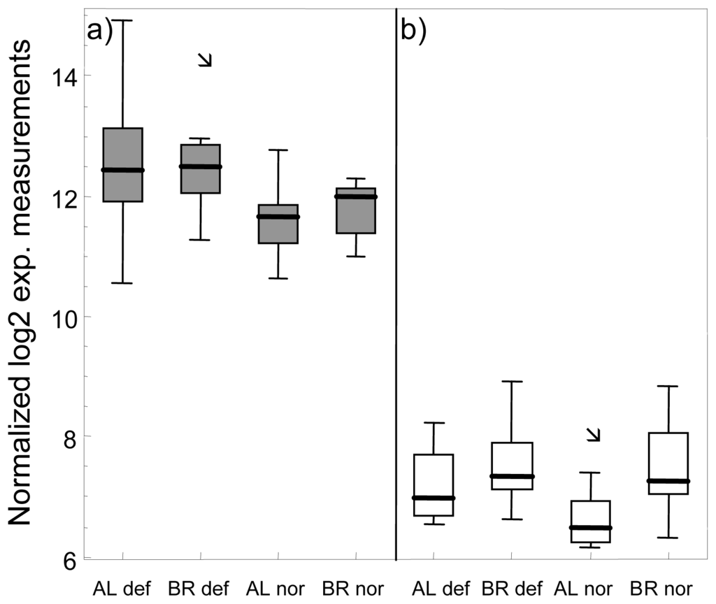 Box plots of log2 normalized gene expression measurements of Ictacalcin in head kidney (a) and liver tissue (b) of normal (nor) and deformed (def) Albock (AL) and Brienzlig (BR) whitefish. Shown are median (vertical line), 25% and 75% quartiles (box), and minimum and maximum value (error bars). Outliers depicted as small squares represent data points that are more than 1.5 times the interquartile range away from the box.