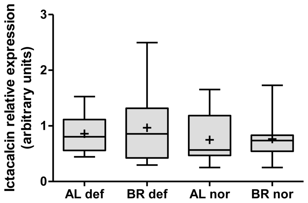 Box plots of relative RT qPCR gene expression measurements of Ictacalcin in head kidney tissue of normal (nor) and deformed (def) Albock (AL) and Brienzlig (BR) whitefish. Shown are median (vertical line), mean (cross), 25% and 75% quartiles (box), and minimum and maximum values (error bars).