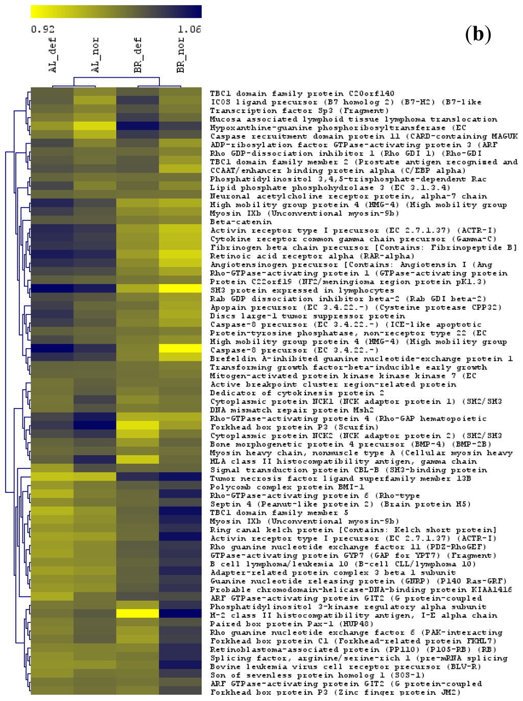 Transcript abundance patterns for 102 genes in the liver (a) and 71 genes in the head kidney (b) found in common across the significant GO categories in comparisons of deformed and normal whitefish of the Albock and the Brienzlig form, respectively. As clustering algorithm, average linkage (UPGMA) was applied. Centered Pearson correlation coefficients were used as distance measures. The dendrogram on the left groups genes with similar expression and the dendrogram on the top separates populations. The colour bar indicates arbitrary expression units. For each gene probe, the mean gene expression levels of each group divided by the global mean across all four groups are shown. Yellow colour (light) designates low expression and purple colour (dark) represents high expression levels respectively.