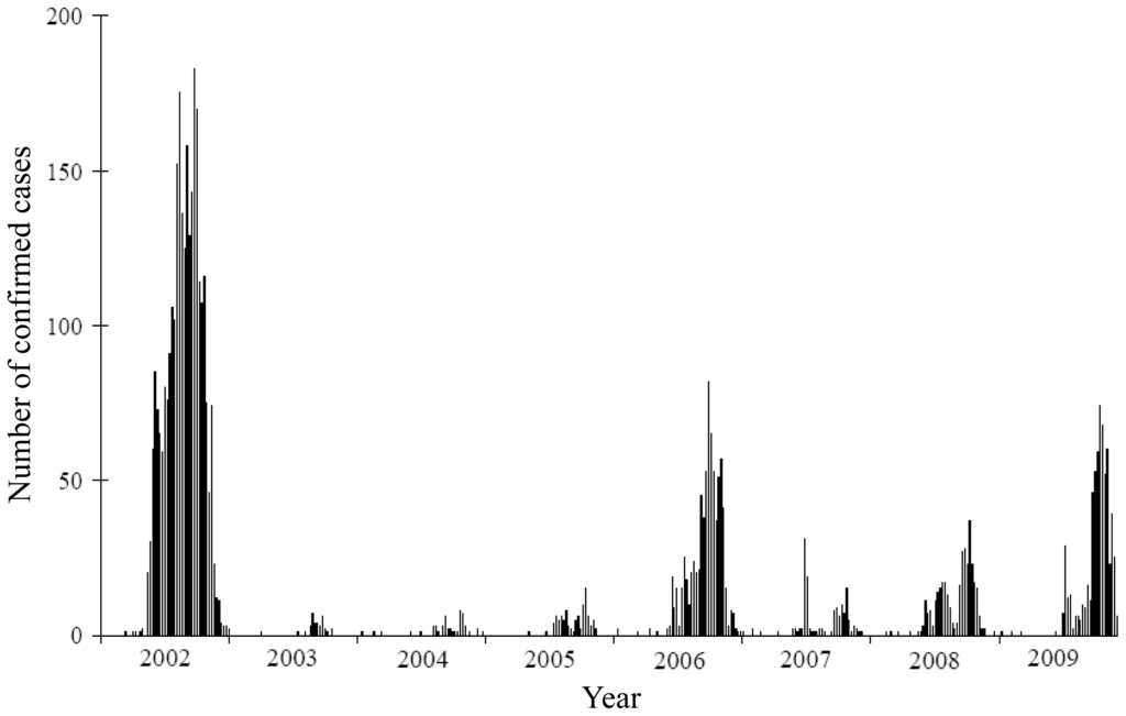 - Cummings, DAT; Irizarry, RA; Huang, NE; Endy, TP; Nisalak, A; Ungchusak, K; Burke, DS. Travelling waves in the occurrence of dengue haemorrhagic fever in Thailand. Nature 2004, 427, 344–347. [Google Scholar]