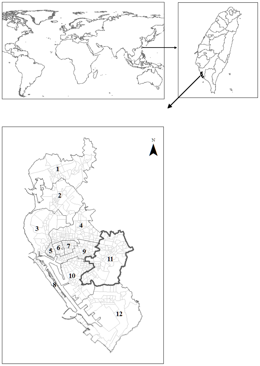 - Wen, TH; Lin, NH; Chao, DY; Hwang, KP; Kan, CC; Lin, KCM; Wu, JTS; Huang, SYJ; Fan, IC; King, CC. Spatial-temporal patterns of dengue in areas at risk of dengue hemorrhagic fever in Kaohsiung, Taiwan, 2002. Int. J. Infect. Dis 2010, 14, e334–e343. [Google Scholar]
