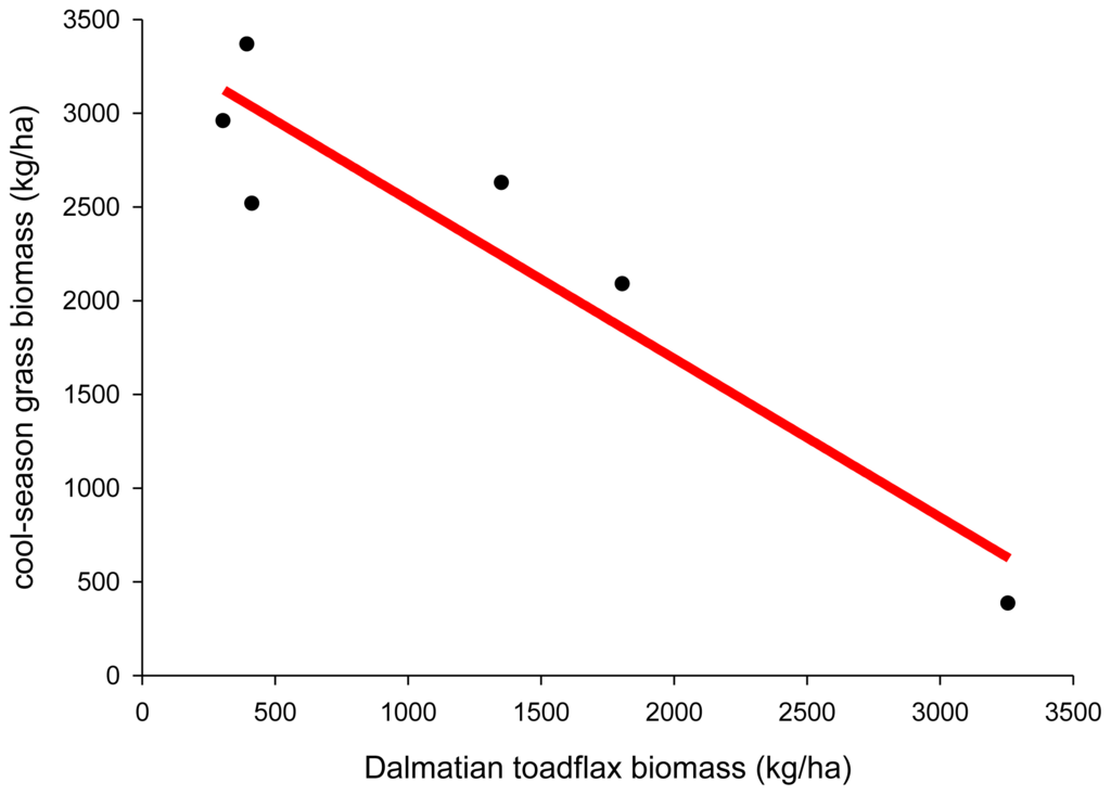 - Gates, DH; Robocker, WC. Revegetation with adapted grasses in competition with Dalmatian toadflax and St. Johnswort. J. Range Manag 1960, 13, 322–326. [Google Scholar]