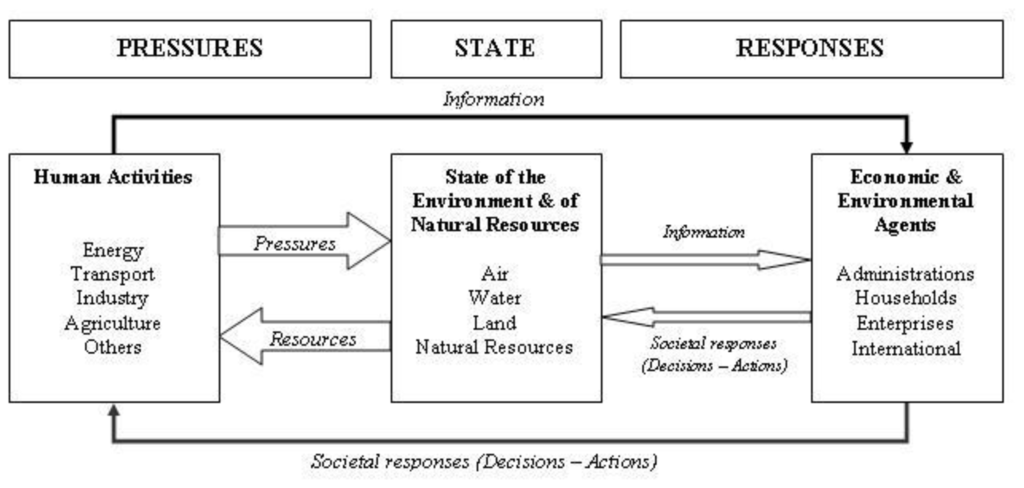 The Pressure-State-Response (PSR) framework was developed in the early 1990s by the Organization for Economic Co-operation and Development [33] to promote a common set of environmental performance indicators.