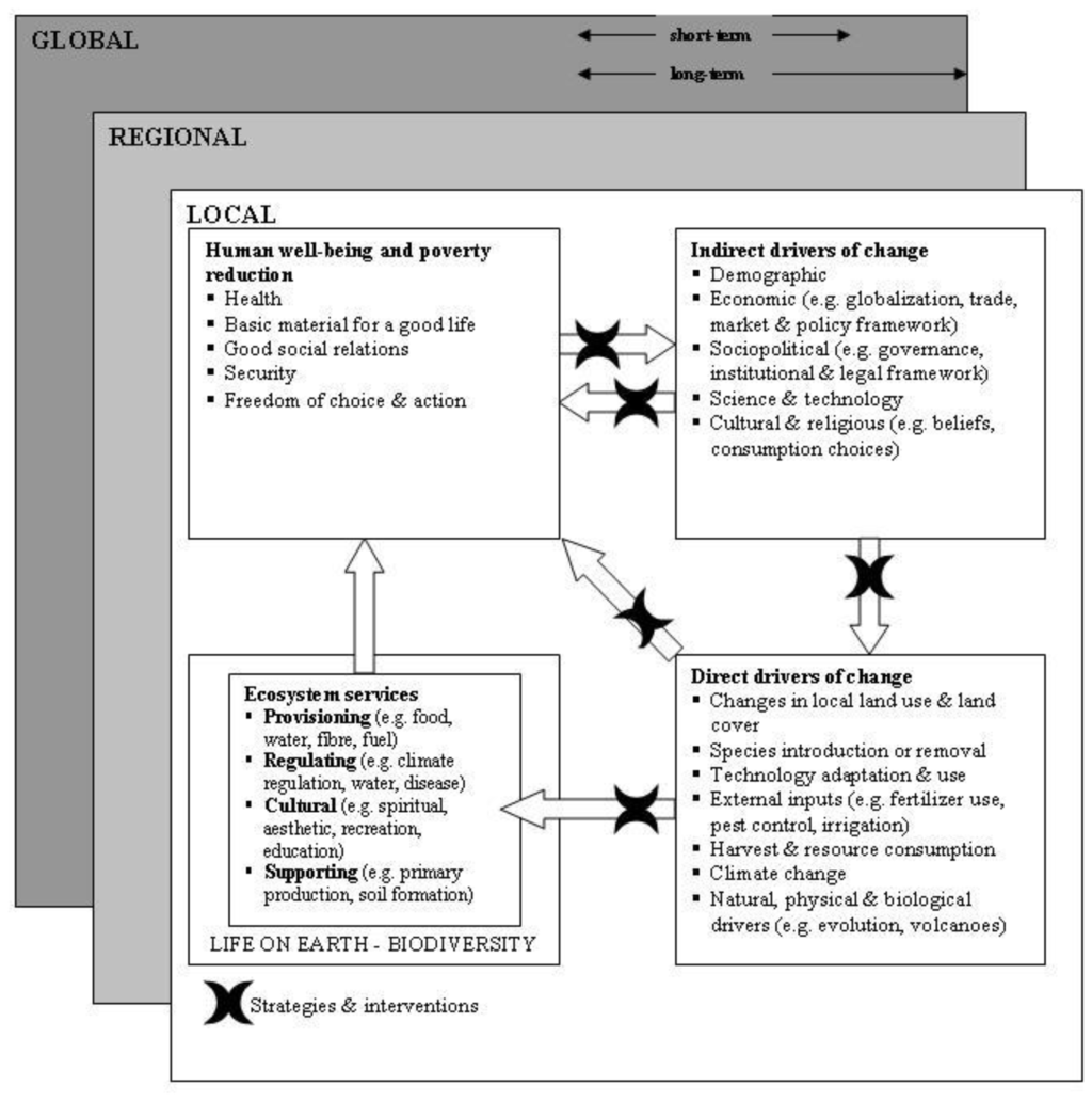 Millennium Ecosystem Assessment framework (reproduced with permission from [42], published by WHO, 2005). Changes in drivers that indirectly affect ecosystems (upper right box) can lead to changes in drivers that directly affect ecosystems (lower right box). The resulting changes in the ecosystem (lower left box) cause ecosystem services to change and thereby affect human well-being (upper left box). These interactions can take place at more than one scale, across scales, and across different timescales. Actions can be taken either to respond to negative changes or to enhance positive changes at almost all points in the framework (cross bars).