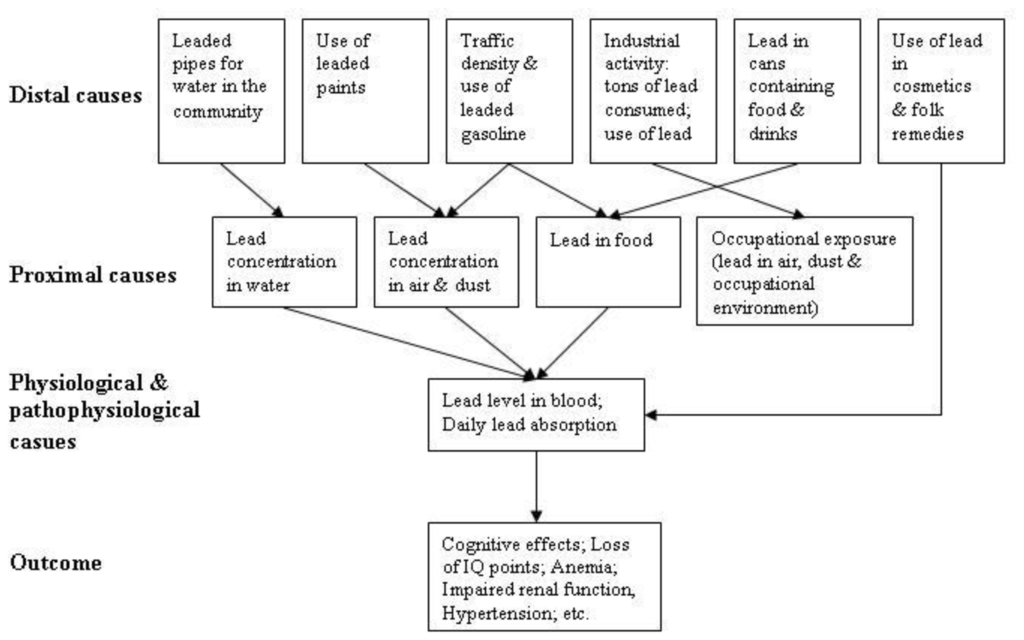 Causal web for chronic exposure to lead (reproduced with permission from [44], published by WHO, 2000). A causal web is a hierarchical cause-to-effect framework, categorizing three levels of risk factors: distal, proximal, and direct (physiological) causes. Distal causes operate through proximal, then direct causes on disease outcome.