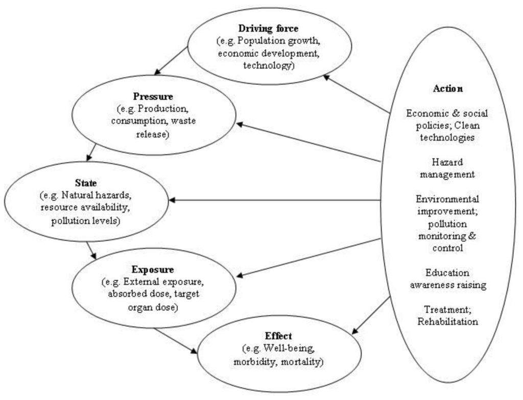 Driving force-Pressure-State-Exposure-Effect-Action framework (reproduced with permission from [14], published by WHO, 1999). The framework describes the environmental health chain through the following components: Driving force (anthropogenic)—factors that motivate and push the environmental process involved. Pressure (on the environment)—are normally expressed through human occupation or exploitation of the environment. State (of the environment)—status of the environment. Exposure (of humans i.e., interaction between the environment and humans)—take place when humans are exposed to environmental conditions. Effect (in humans)—health effects from exposure to the environmental hazard. Action—policies or interventions aimed at reducing or avoiding health effects, they can be aimed at any point in the framework.