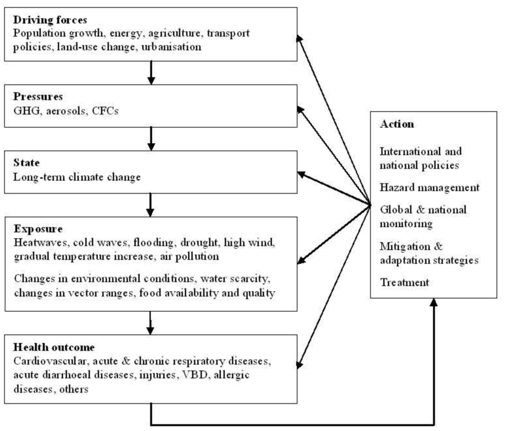 Driving force-Pressure-State-Exposure-Effect-Action framework applied to climate change [7].
