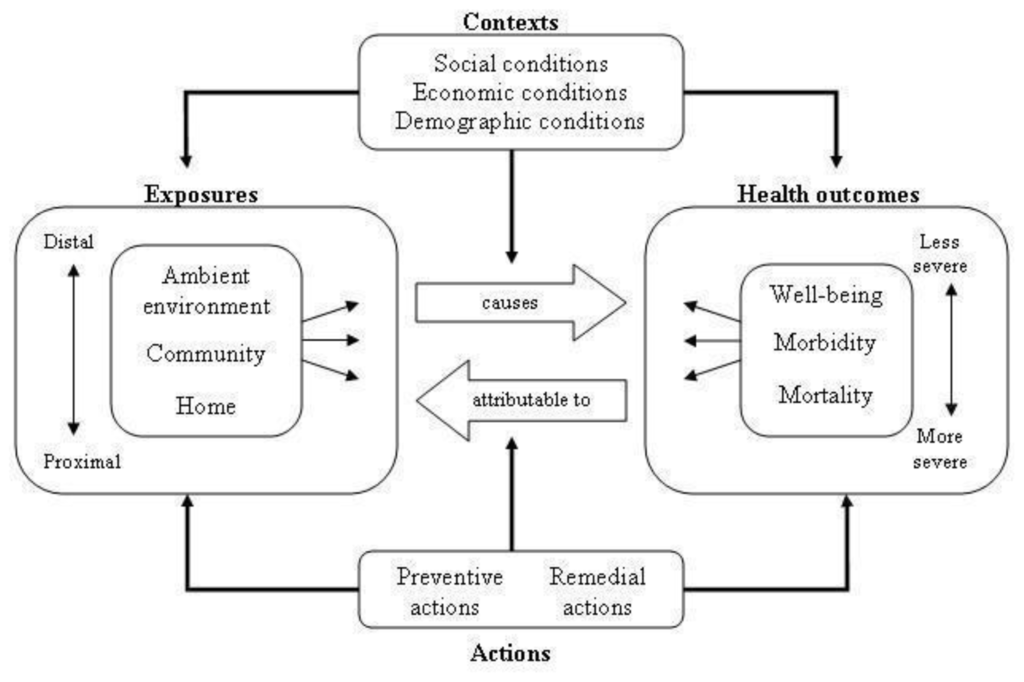 The MEME framework emphasizes the complex relationships between the environment and health, including recognition of contextual factors (Table 1). However, it does not separate proximal (exposures) from distal (pressure and state) causes. The ability of a framework to distinguish proximal from distal causes is particularly useful for designing and applying interventions further up the causal chain. These higher level interventions may often be more cost effective in reducing negative health outcomes. Therefore, for complex environmental health issues (such as health effects due to climate change) it may be helpful to arrange the issues more formally as in the DPSEEA framework.