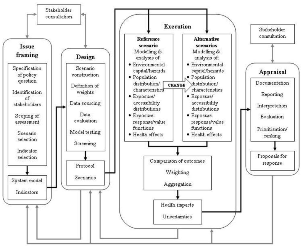 Integrated Environmental Health Impact Assessment framework [58]. This is a four-stage process, comprizing of: Issue framing—defines the problem/purpose for assessment. This focuses and limits the scope of assessment and management options. Design—purpose is to convert the conceptual model devised during issue framing into a detailed protocol for assessment. Execution—the core of the assessment process. Appraisal—synthesis and interpretation of results.