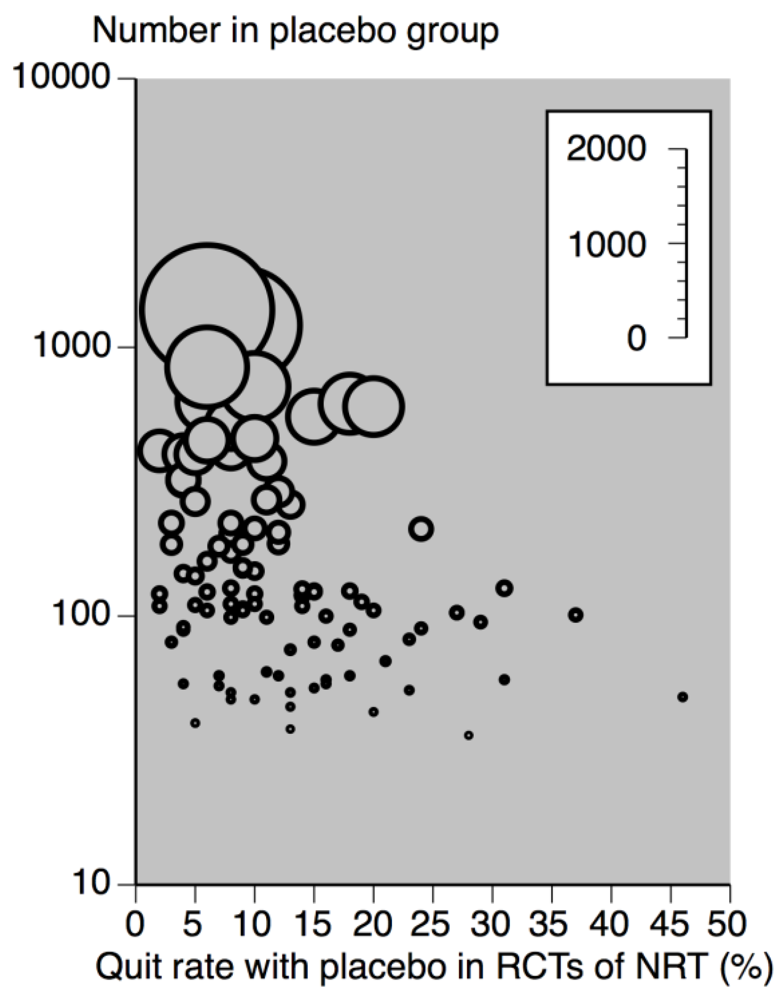 Cessation (quit) rates with placebo in NRT studies according to number in placebo group (size of symbol proportional to number in placebo group, inset scale) (data from Stead et al., 2008 [22]).