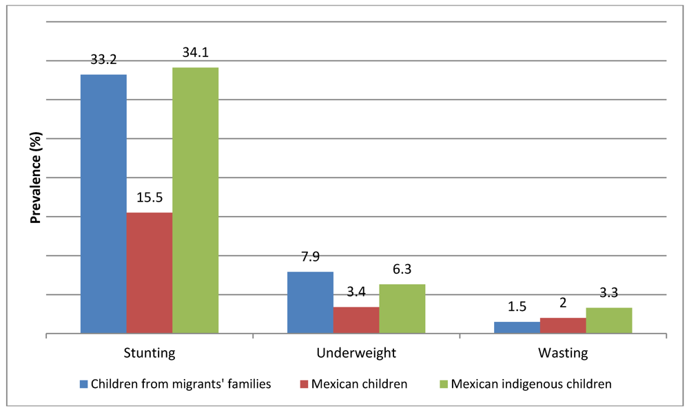 Data from the National Survey on Nutrition and Health (ENSANUT) based on the NCHS 1970’s growth standards [11], reported 7.1% of stunting among a general sample of children under five in northern Mexico. Migrant children of the same age have prevalences of stunting 15.7% higher (22.8%). Data for underweight and wasting were 3.9% versus 16.1% and 2% versus 4.2%, for northern Mexico children and migrant children, respectively (data not shown).