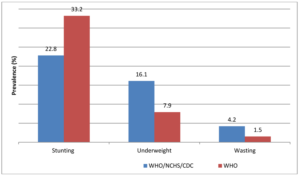 Since most of the publications on Mexican childrens’ nutritional status compare data from National Surveys from 1988, 1999 and 2006 [11], Figure 2 shows prevalence of stunting, underweight and wasting in migrant children less than five years old based on the WHO 2006 child growth standards, and the NCHS 1970’s growth standards [23]. Average figures for stunting were 10.4 percentage points higher when the 2006 WHO reference standards [20] were used, while data on underweight and wasting seemed lower.