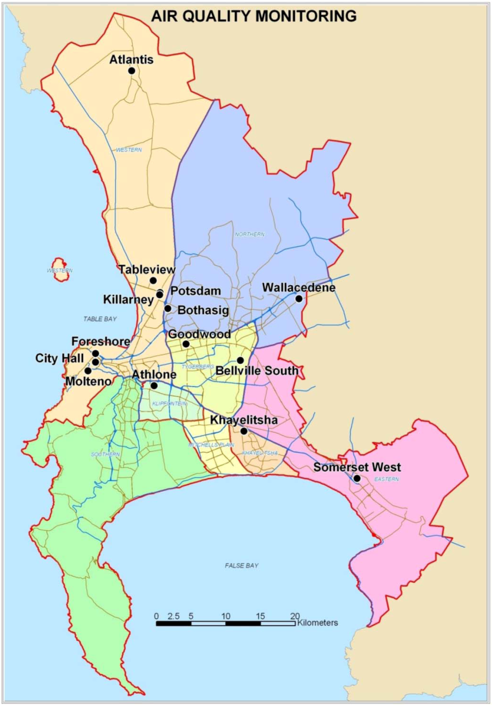 Exposure to outdoor air pollutants is essentially beyond the control of individuals and requires action by public authorities at the national, regional and even international levels. Outdoor air quality remains a key issue in Cape Town [4]. The main sources of PM10 are diesel vehicles, wood and coal burning for household heating and cooking fuel, dust from construction activities and unpaved roads, as well as wind-blown dust. The main sources of NO2 and SO2 are diesel vehicles and coal burning for household fuel, as there are few large industries in the city [4].