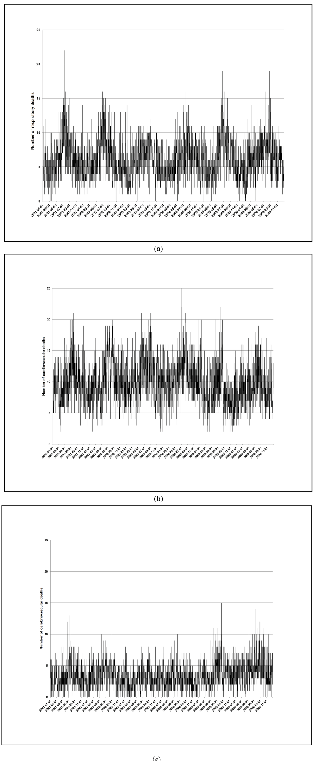 Figure A2. Time series of respiratory (a), cardiovascular (b) and cerebrovascular mortality (c) in Cape Town during 1 January 2001–31 December 2006.