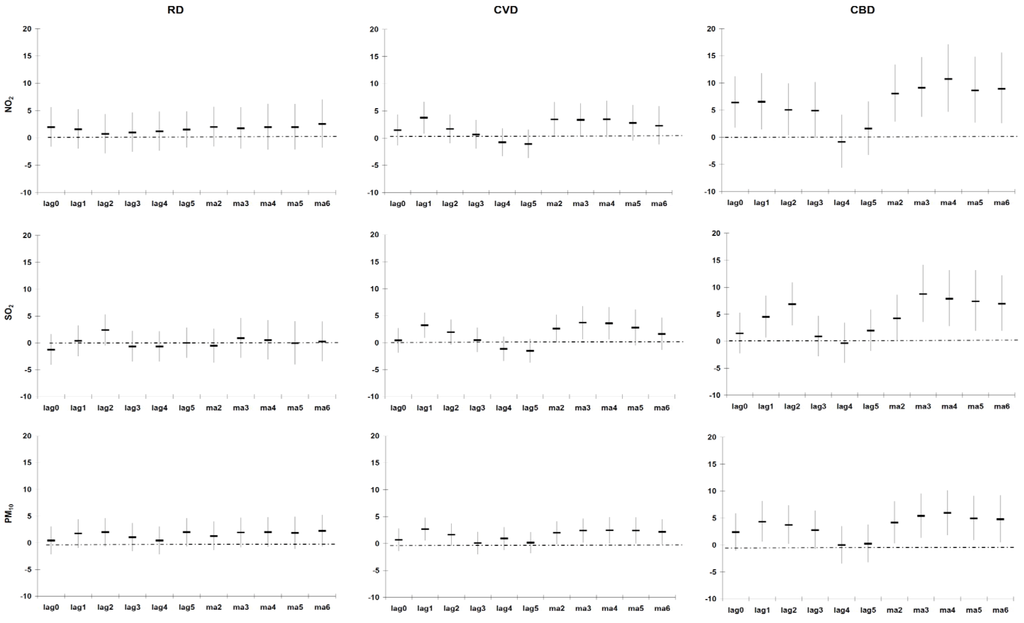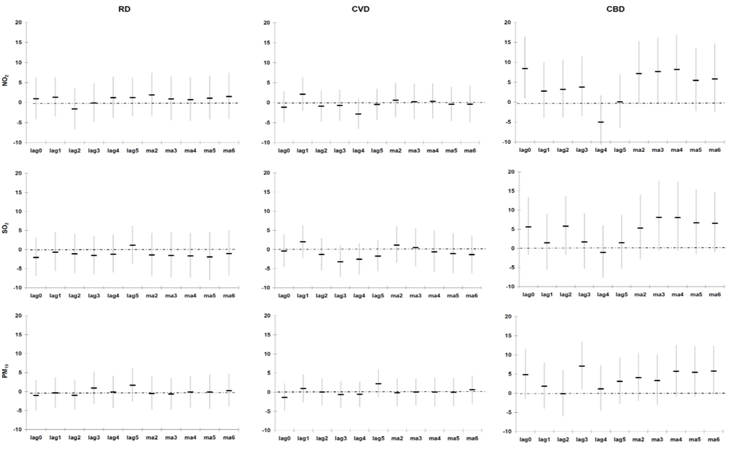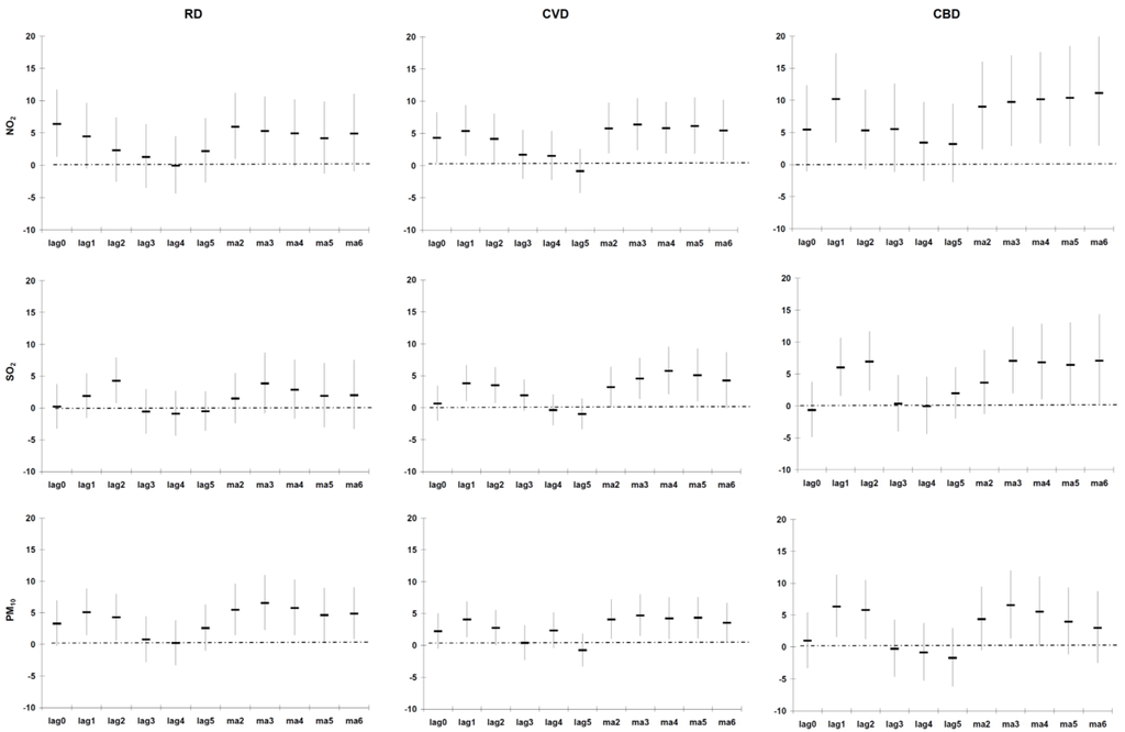 Figure A5, Figure A6, Figure A7 (see Appendix) illustrate the % change in the cause-specific mortality per IQR increase in the different lags of PM10, NO2 and SO2 during 2001–2006 for the entire year, the warm and cold periods, after adjusting for Tapp, rainfall, wind speed and public holidays. In general the strongest significant association was observed between the CA2 of the pollutants (lowest AIC). CA2 of the pollutants was thus selected in the subsequent analyses.