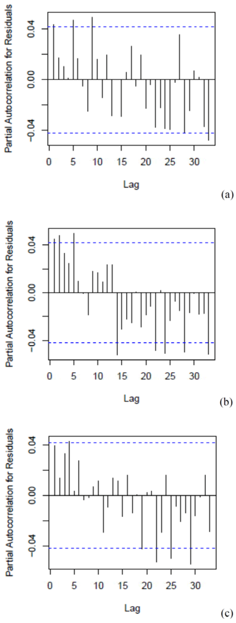 Figure A9. Partial autocorrelation function residuals for the generalised additive Poisson time-series regression models (entire year): 2-day cumulative average of PM10 and RD (a), CVD (b) and CBD (c) mortality in Cape Town, South Africa during 2001–2006. Adjusted for the 2-day cumulative average of PM10, NO2 or SO2, and long term seasonal trends, public holidays, day of the week, 2-day cumulative averages of 24-h apparent temperature, wind and rain. K = 30 for time, i.e. 5df/year.