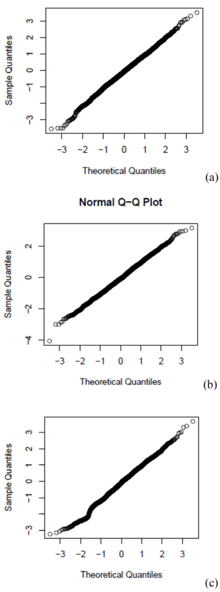 Figure A10. Normal Q-Q plot for the generalised additive Poisson time-series regression models (entire year): RD (a), CVD (b) and CBD (c) mortality in Cape Town, South Africa during 2001–2006. Adjusted for the 2-day cumulative average of PM10, NO2 or SO2, and long term seasonal trends, public holidays, day of the week, 2-day cumulative averages of 24-h apparent temperature, wind and rain. K = 30 for time, i.e. 5df/year.