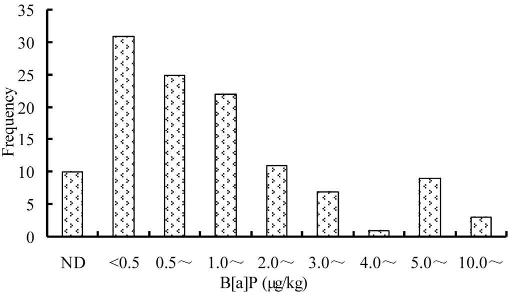 The average, standard deviation and the ranges for the B[a]P contents in a total of 119 food samples classified in 12 categories and obtained from local markets in Guangzhou are summarized in Table 1. The frequency distribution of B[a]P contents in food is illustrated in Figure 2. One hundred and five out of the 119 samples showed levels of B[a]P with ranging from 0.03 to 19.75 µg/kg, which was above the LOD (Table 1). Fifty two out of 105 positive samples were found to contain B[a]P at levels lower than 1.0 µg/kg, and 22 samples out of 105 positive samples showed B[a]P contents ranging from 1.0 to 5.0 µg/kg. The levels of B[a]P in 12 of the positive samples ranged between 5.08 and 19.75 µg/kg. This means that 10.1% of the total samples contained B[a]P above the established Chinese food limit, where a maximal level of 5 µg/kg for B[a]P is recommended for food. This indicated that B[a]P was widely present in foods, and the highest level was near four times as high as the Chinese limit.