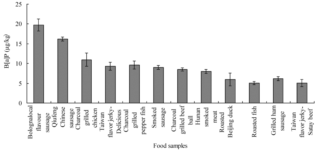 Guangzhou City, with its rapid economic growth, is an important industrial, cultural, foreign trade and communications center in south China. It is also one of the most important traffic nodes for businessmen travelling between China Mainland and Hong Kong, Macau, Taiwan, and many countries in the World as well. Therefore, there are people from many different regions or countries living in Guangzhou. The quality of food sold in Guangzhou not only relates to the health of Chinese people, but also the health of visiting guests from other countries. The foods prepared by smoking and grilling, especially charcoal-grilled meat, are widely consumed by the public due to its favored flavor. When the levels of B[a]P in some charcoal-grilled and smoked food samples from Guangzhou were evaluated in our laboratory, considerably high concentrations of B[a]P (>10 µg/kg) were found in some foods, which exceed the admissible level in food of China (5 µg/kg), and may be hazardous for public health. Therefore, this study has been carried out to evaluate the level of B[a]P in 119 selected foods to supply new information on B[a]P levels in a variety of foods from China.