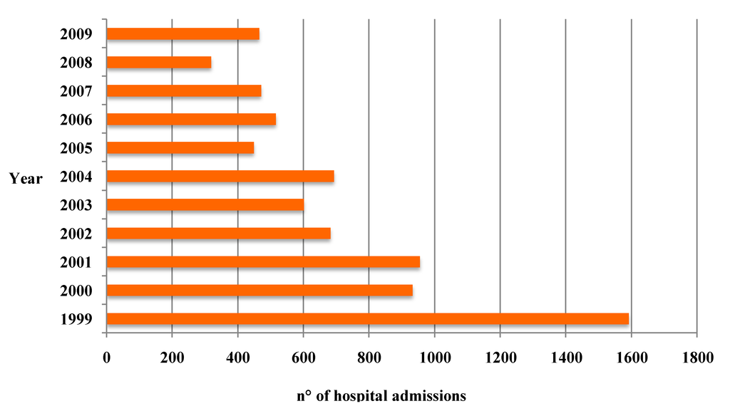 - Marocco, A.; Assael, B.; Gabutti, G.; Guarino, A.; Lopalco, P.L.; Marchetti, F.; Ruggeri, F.M.; Titone, L.; Tozzi, A.E.; Vitali Rosati, G.; Zotti, C.; Franco, E. Hospitalisation associated with Rotavirus gastroenteritis in Italy, 2001–2003, evaluated by means of ICD9-CM diagnostic codes. Ig. Sanita Pubbl. 2006, 62, 215–244. [Google Scholar]