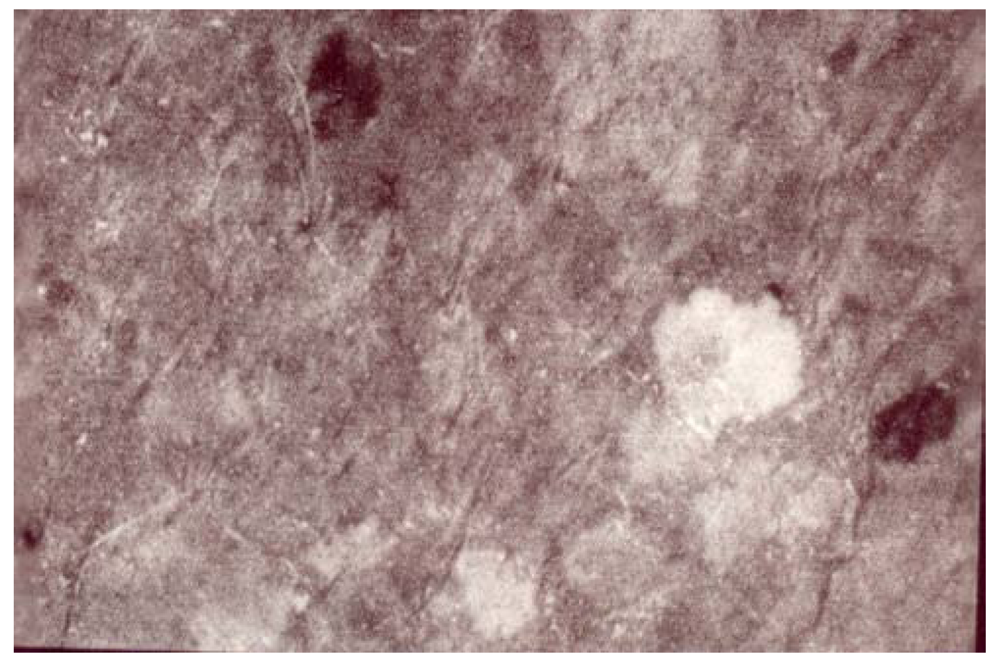 The melanotic spots MSM were admixed with a few amelanotic SIS scattered among the MSM structures. Annular and circinate figures of MSM and SIS were never disclosed. The SIS were iridescent and uniform in color. Their sizes were variable (Figure 1, Figure 2, Figure 3). They were never clustered. A total of 17/132 SIS were disclosed on any body site of TS, but they predominated over the dorsal forearms and on the anterior aspect of the legs. By contrast, only 2/132 SIS were disclosed in CS. Hence, the melanin mapping over the light-exposed limb areas combined both hyper- and hypomelanotic spotty areas.