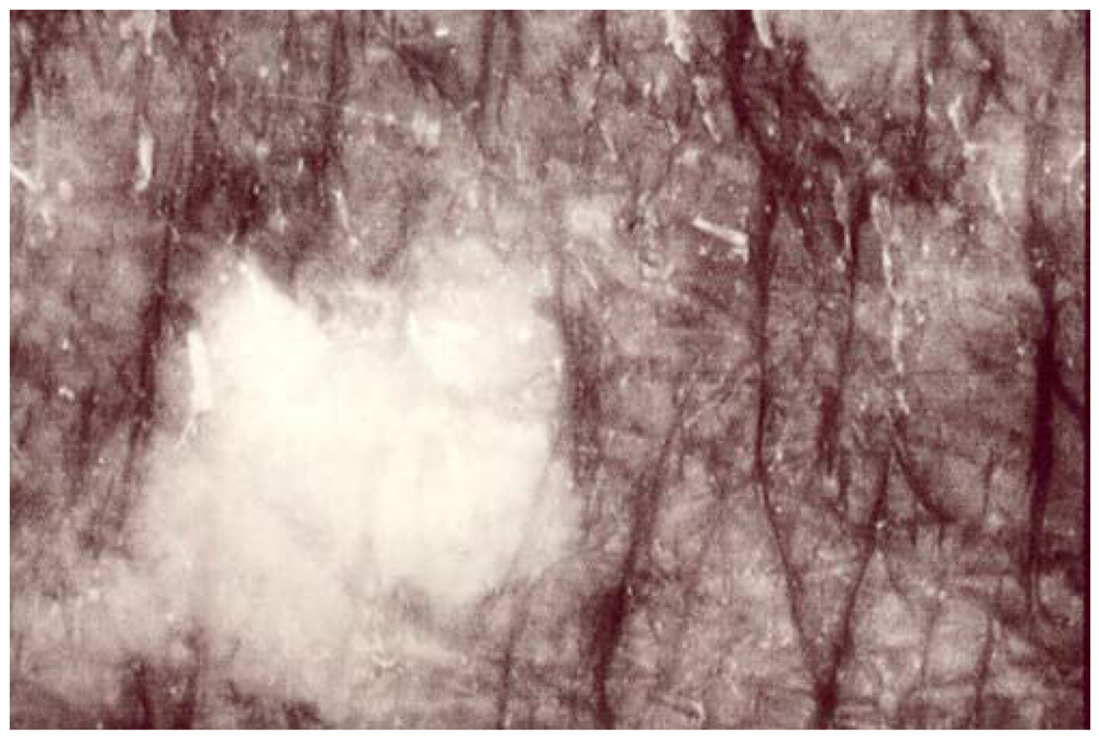 The acquired discrete uneven skin pigmentation forming the MSM patterns is a hallmark of photoaging [1,2,14]. Once delivered by melanocytes to keratinocytes, melanin acts in part as a UV-filter [15]. However, according to individual parameters including the phototype, age and cumulative UV light exposure, skin presents distinct MSM appearances [2]. The diverse patterns of age-related MSM is conveniently disclosed and magnified using the computerized UV light-enhanced visualization (ULEV) method [1,2,14]. A CCD camera equipped with an internal UV-emitting unit is suited for such precise quantification of the epidermal melanin content. The increased contrast between the faint MSM and the near skin is the combined result of: (a) the greater reflection of UV wavelengths than visible light by dermal collagen and (b) the greater UV absorption by epidermal melanin. Any other UV-absorbing or reflecting structure interposed above the collagen network alter the aspect at the ULEV examination [2]. Previous observations indicated that some individuals exhibited rare foci of nearly total depigmentation [2,16]. The focal amelanotic skin appeared as white irridescent skin ivory spots (SIS).