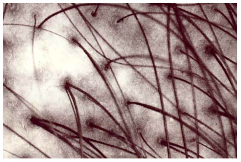 - Petit, L.; Piérard-Franchimont, C.; Saint Léger, D.; Loussouarn, G.; Piérard, G.E. Subclinical speckled perifollicular melanosis of the scalp. Eur. J. Dermatol. 2002, 12, 565–568. [Google Scholar]