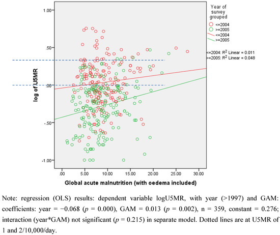 GAM is defined as percentage of the children sampled in each survey of less than minus 2 standard deviations of reference standards, plus prevalence of oedema (usually a fraction of wasting prevalence). When prevalences were reported based on NCHS standards, these were transformed to the equivalent using WHO standards using the WHO algorithm [14] (neglecting oedema). U5MR was estimated generally using a 90-day recall period, and is given as deaths/10,000/day. Extreme values were excluded to avoid their undue influence on the results as follows. Values greater than 50% GAM prevalence were excluded (8 cases: >+4SDs). A cut-point for U5MR of greater than 7 (>3SDs; 23 cases) was used. Otherwise all data from 1997 to 2009 were included.