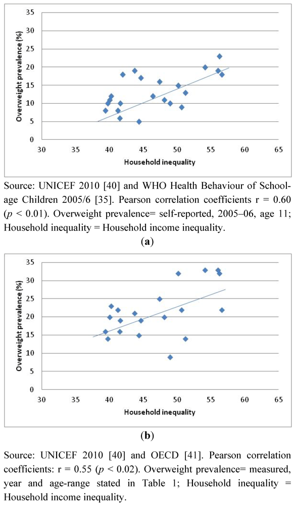 | Income inequality *: households with children, 2008 a (%) | Overweight prevalence (self-reported, 2005-2006, age 11) b | Overweight prevalence (measured, year and age-range stated) c | |