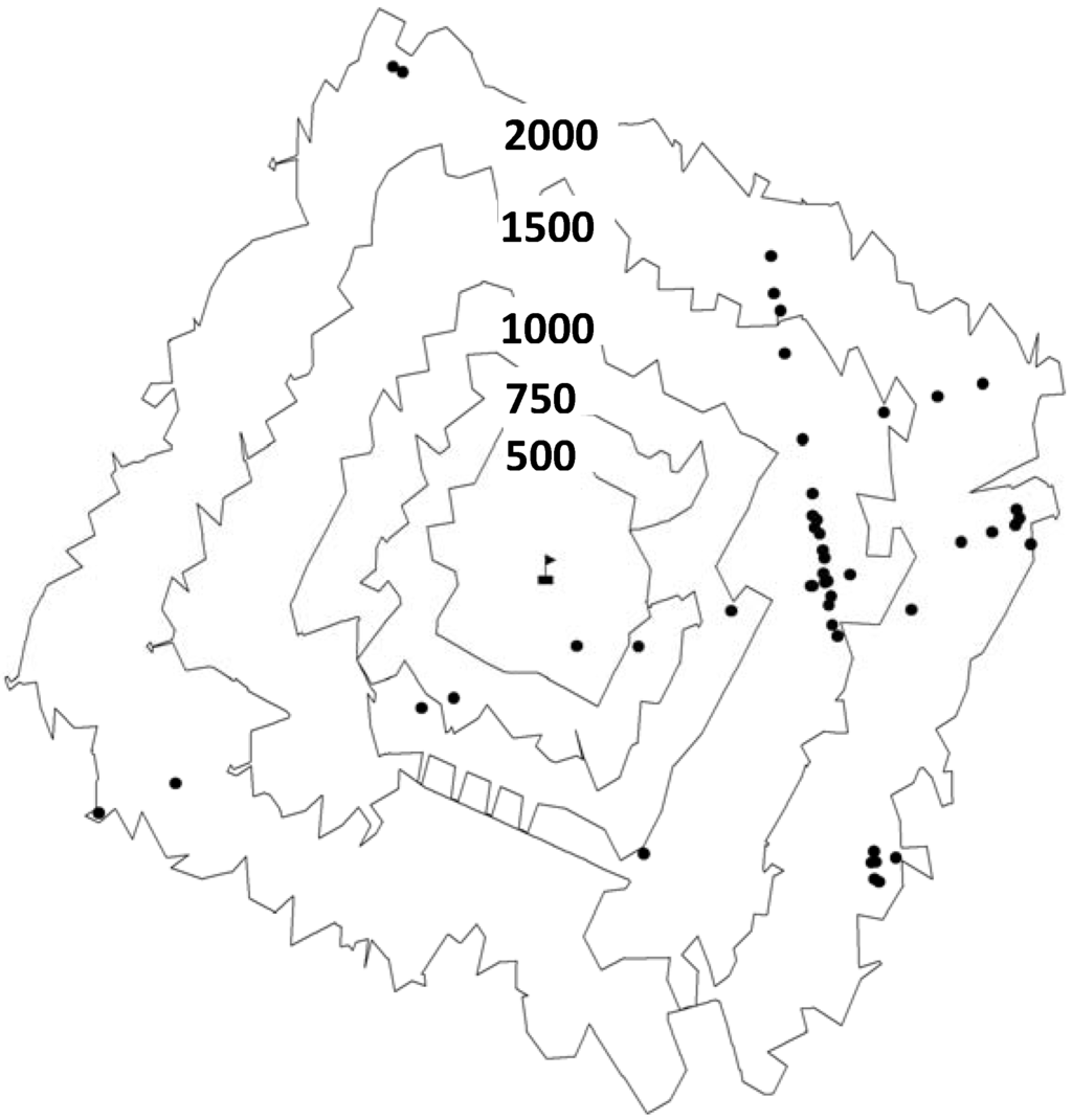 The school is in the centre of the figure and is surrounded by increasing buffer sizes, ranging from 500 m to 2,000 m. The food retailers are represented by black circles.