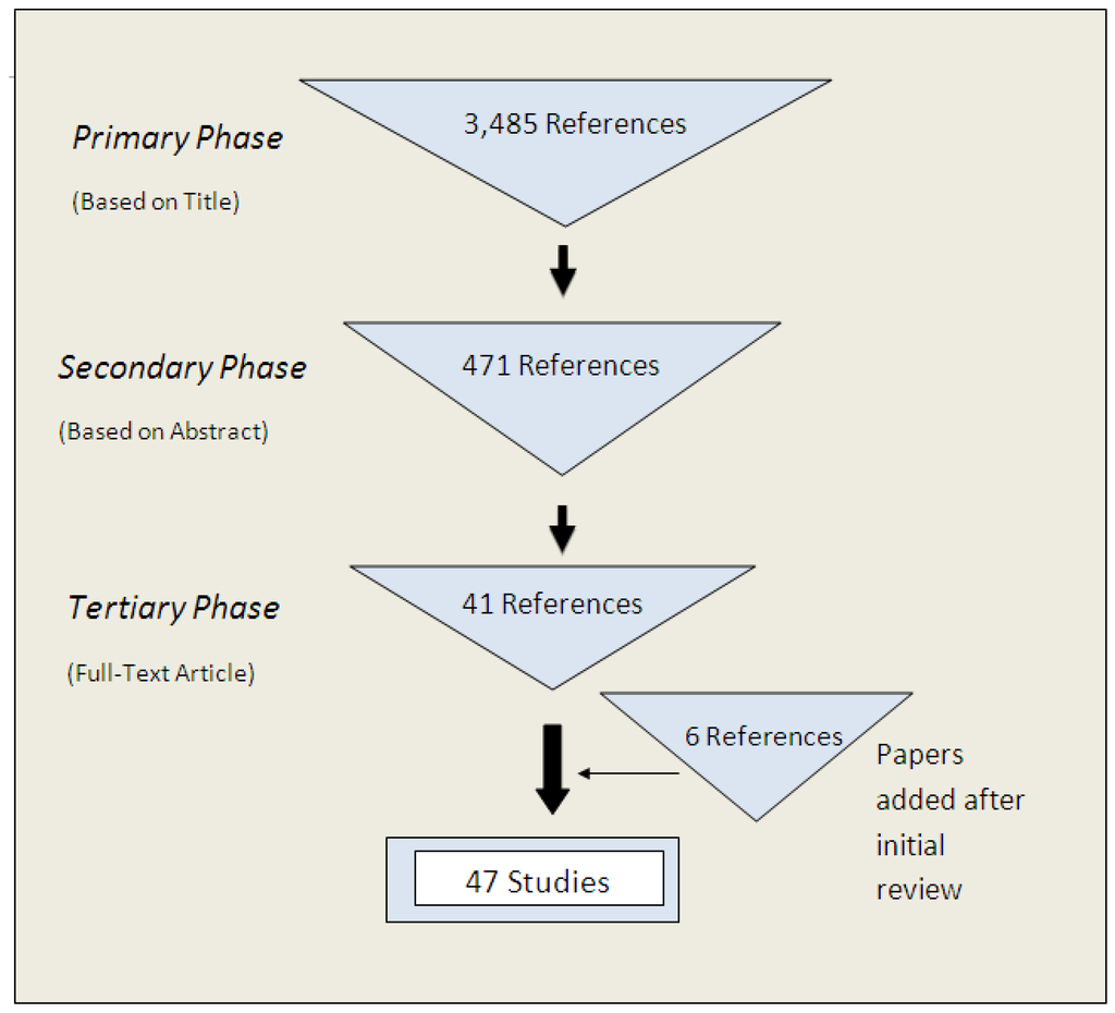 The primary search identified 3,485 publications whose titles discussed water provision, water quality or sanitation facilities in schools. The majority of these references came from scientific databases (n = 3,312), with the majority from PubMed (n = 2,025). The secondary screening based on abstract identified 471 relevant references. Thirty-nine articles met the inclusion criteria for the tertiary, full-text, review. Bibliographies of these articles revealed an additional six articles. Four of the 39 included studies were excluded from the library due to duplication in multiple papers; in these cases the most comprehensive article from each of these studies was included. Forty-one papers were included in the initial systematic review. Six more studies were added after the initial review, making forty-seven included studies used in data analysis (n = 47) (Figure 1).
