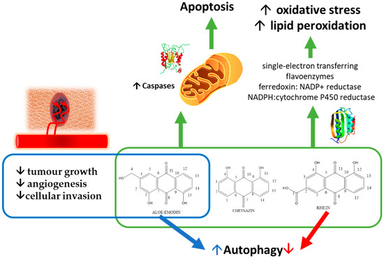 Rhein (5-dihydroxyanthraquinone-2-carboxylic acid) is a naturally occurring anthraquinone derivative found in rhubarb roots, such as Rheum palmatum, and various plant species, for example, Leguminosae and Polygonaceae [62,63,64]. Research has shown the biological activities of rhein, including antitumour, anti-inflammatory, anti-angiogenic, and antibacterial activities [63,65]. It promotes in vitro apoptosis in several cancer cell lines such as the promyelocytic leukaemia cell (HL-60), human colonic adenocarcinoma cells, and cervical cancer Ca SKi cells [33,66]. It also induces apoptosis in nasopharyngeal carcinoma cells and human tongue cancer cells by both caspase and mitochondrial death pathways [33]. Similarly, it elicits in vitro cytotoxicity in primary human liver hl-7702 cells by inducing apoptosis through a mitochondria-mediated pathway [67]. Additionally, rhein has cytotoxic activity versus HCT-116 human colon cancer cells by enhancing the intrinsic apoptotic pathway [68]. Moreover, rhein can suppress cancer cell growth in rat livers in vivo [33,66]. Contrarily to AE, Rhein seems to inhibit autophagy in cancer cells, but such a prolonged effect eventually induces apoptosis [62,69].