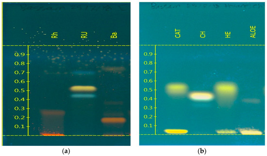 Many mobile phase systems have been trialled in classic TLC according to the literature reviews in order to find a suitable system; these include ethyl acetate-methanol-water (10:2:1), petrol ether-ethyl acetate-formic acid (75:25:1), petrol ether-ethyl acetate-formic acid (75:25:1), and toluene-ethyl acetate-ethanol-formic acid (10:8:1:2) [82,83,84,85,86,87,88]. The results of all these systems showed unsuccessful separation and similar Rf values, and all the bands migrated and appeared at the top of the plate with polar systems. In addition, once the polarity of the mobile phase decreased, some compounds such as rugulosin, rhein, and barbaloin did not migrate and showed no spots. After testing over 30 different TLC conditions previously reported, we opted for developing two new conditions due to their differences in polarity. Two different mobile phases were finally chosen: (1) ethyl acetate: 2-propanol: formic acid (84:16:1 v/v/v) and (2) hexane fraction from petroleum: chloroform: formic acid (80:2:1 v/v/v). These are the best for separation of rugulosin/rhein/barbaloin and aloe-emodin/catenarin/chrysazin/helminthosporin, respectively. Table 1 and Figure 3 show the results and Rf values of the major bands.